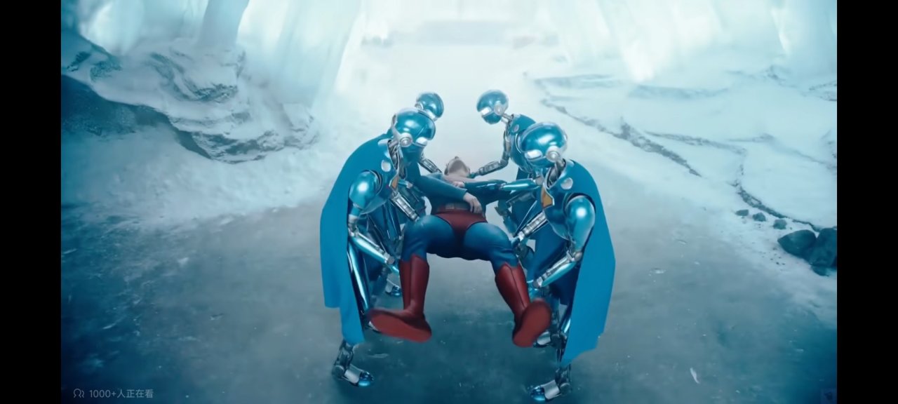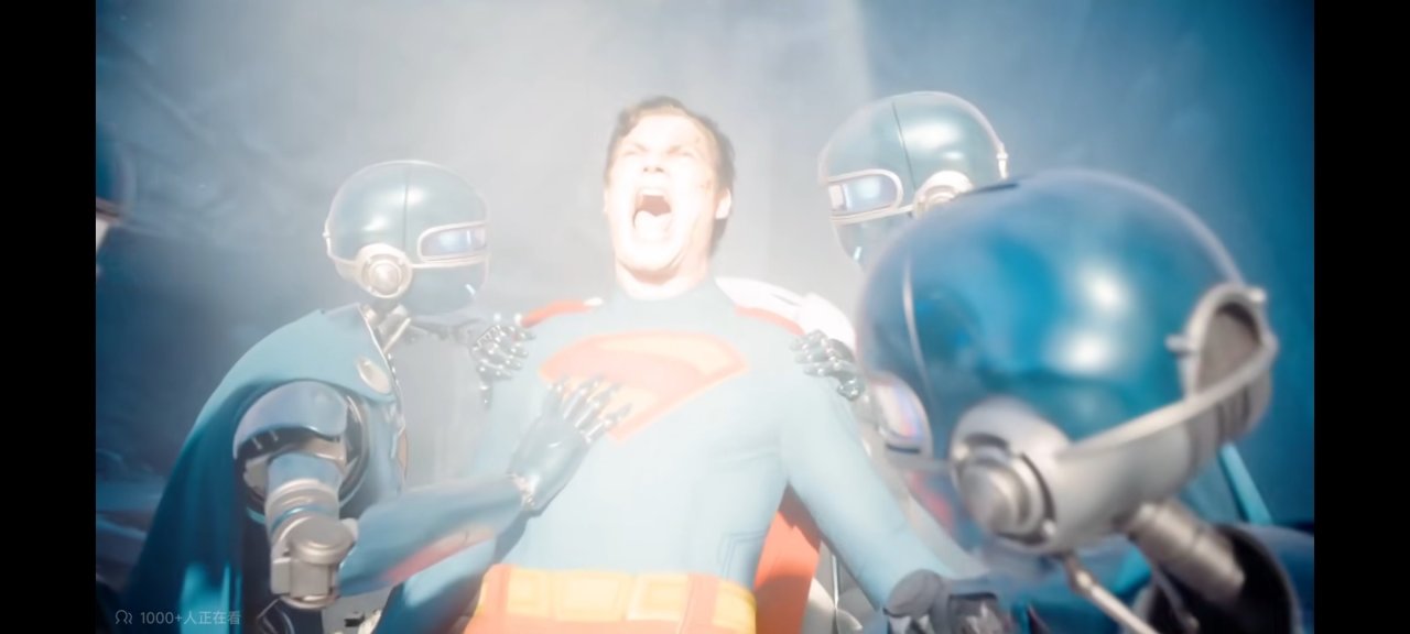 这里大概率是接受阳光照射补血,但是机器人的手在干嘛?还有这个大喊大叫是超人对阳光过敏了吗?