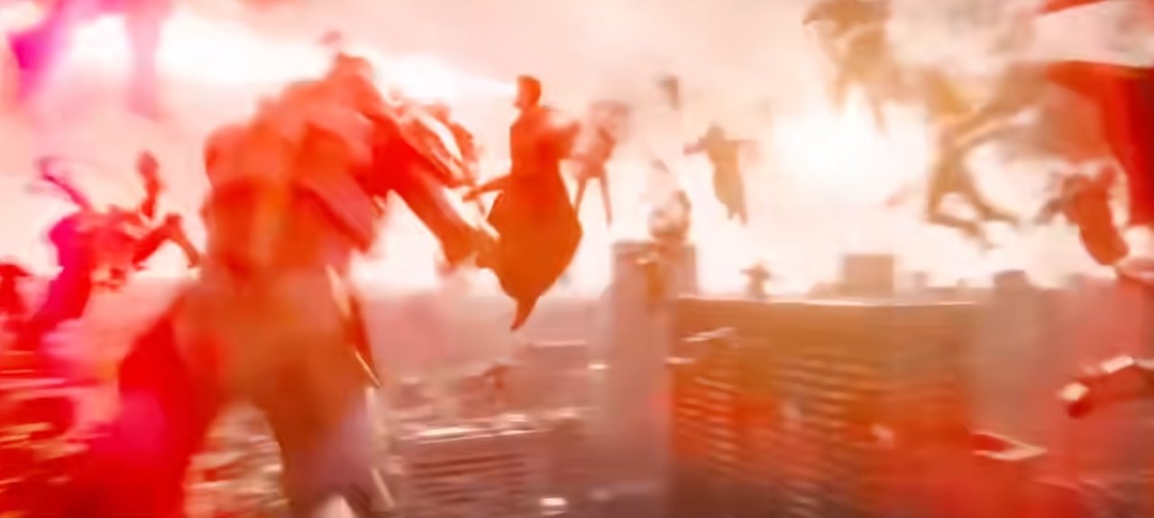 预告片开头就是超人拯救倒塌的大楼,趴在上面将他推起来。