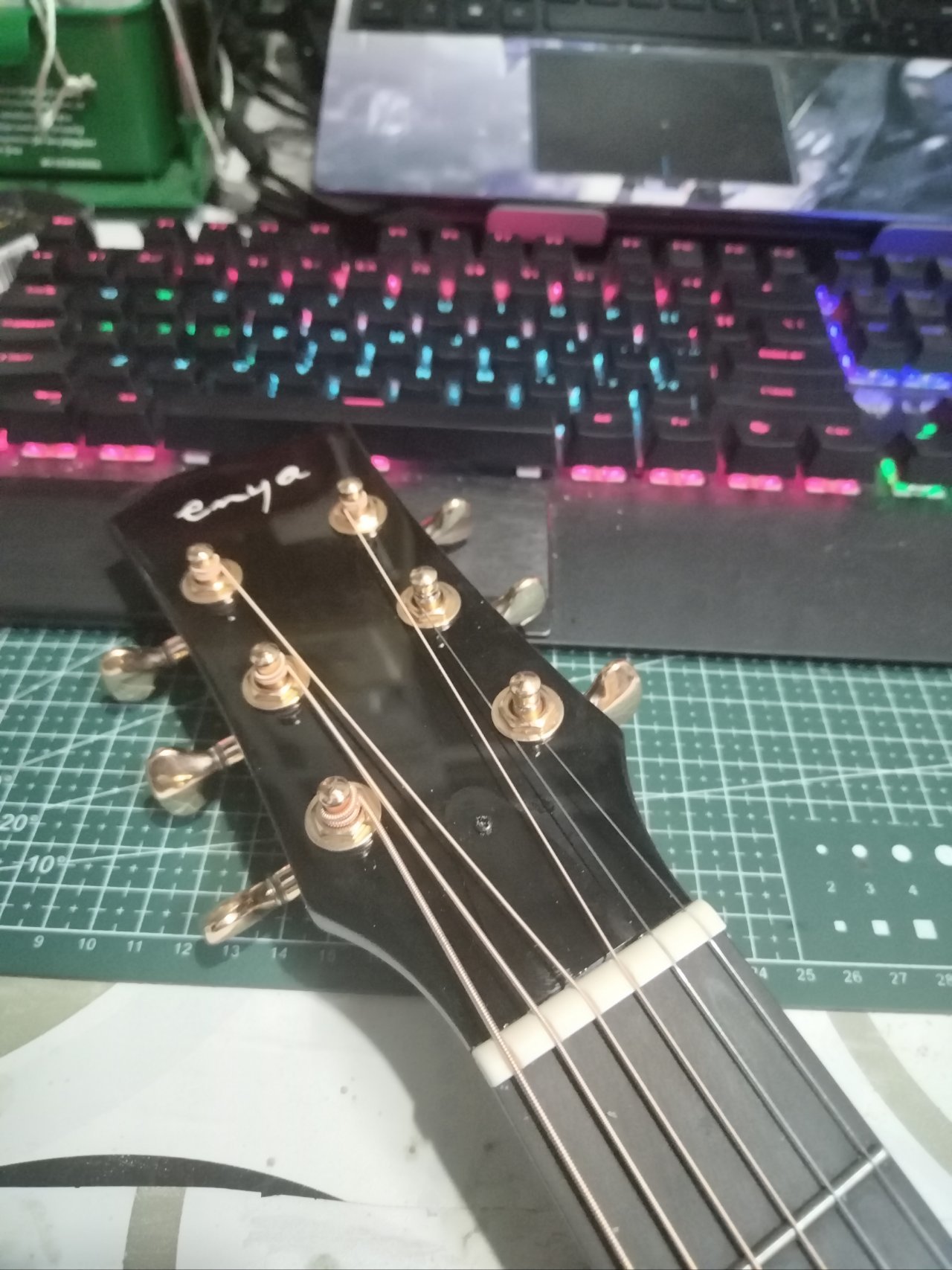 这里也没有什么弯弯绕绕的东西,你只需要知道调弦在琴头调。从粗到细分别是EADGBE的音调,下载一个调音软件,以6弦最粗的弦为例,拨响后调音器上会出现英文,扭一下对应弦的旋钮(注意要慢一点有些琴发货不注意调弦后容易崩)直到出现e的字样,偏左说明音调偏低,往音调高一点扭,反之。直到指针指到正中,或者调音器发出调音完成的提示音。