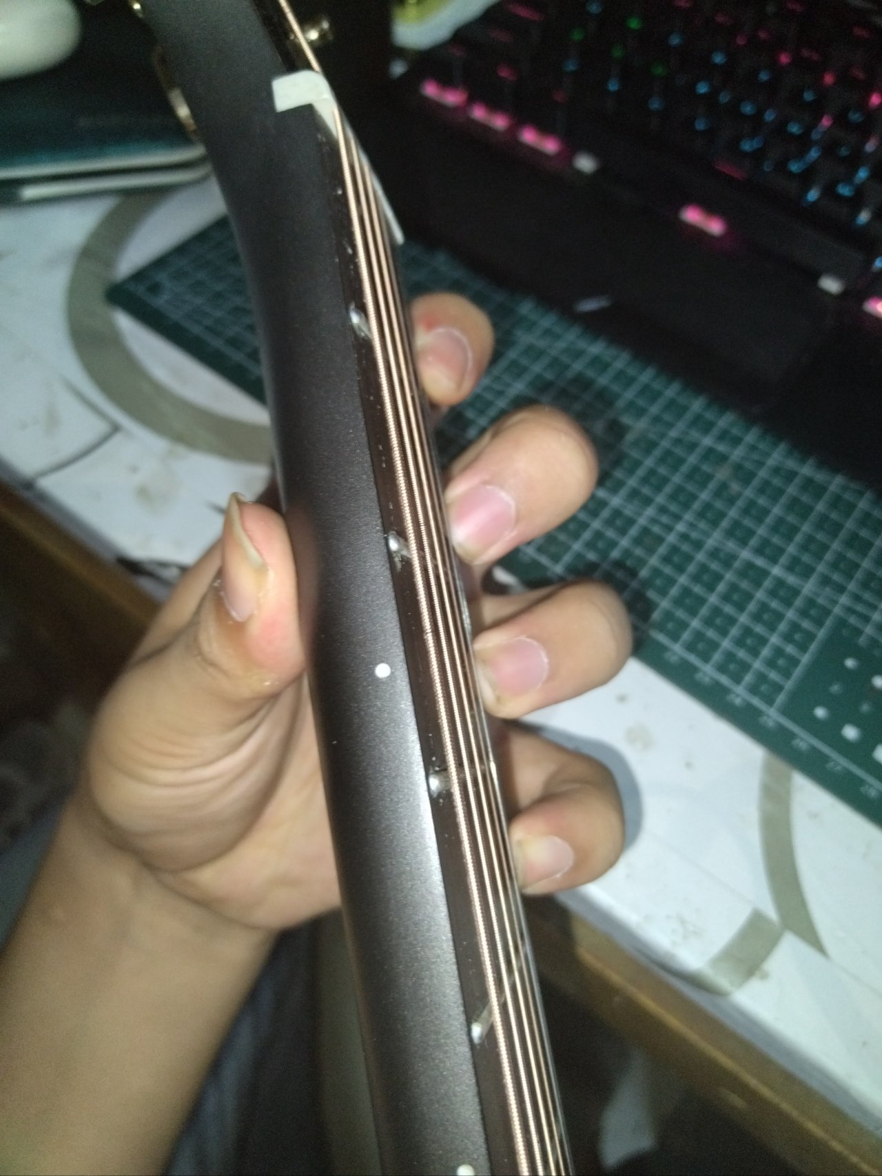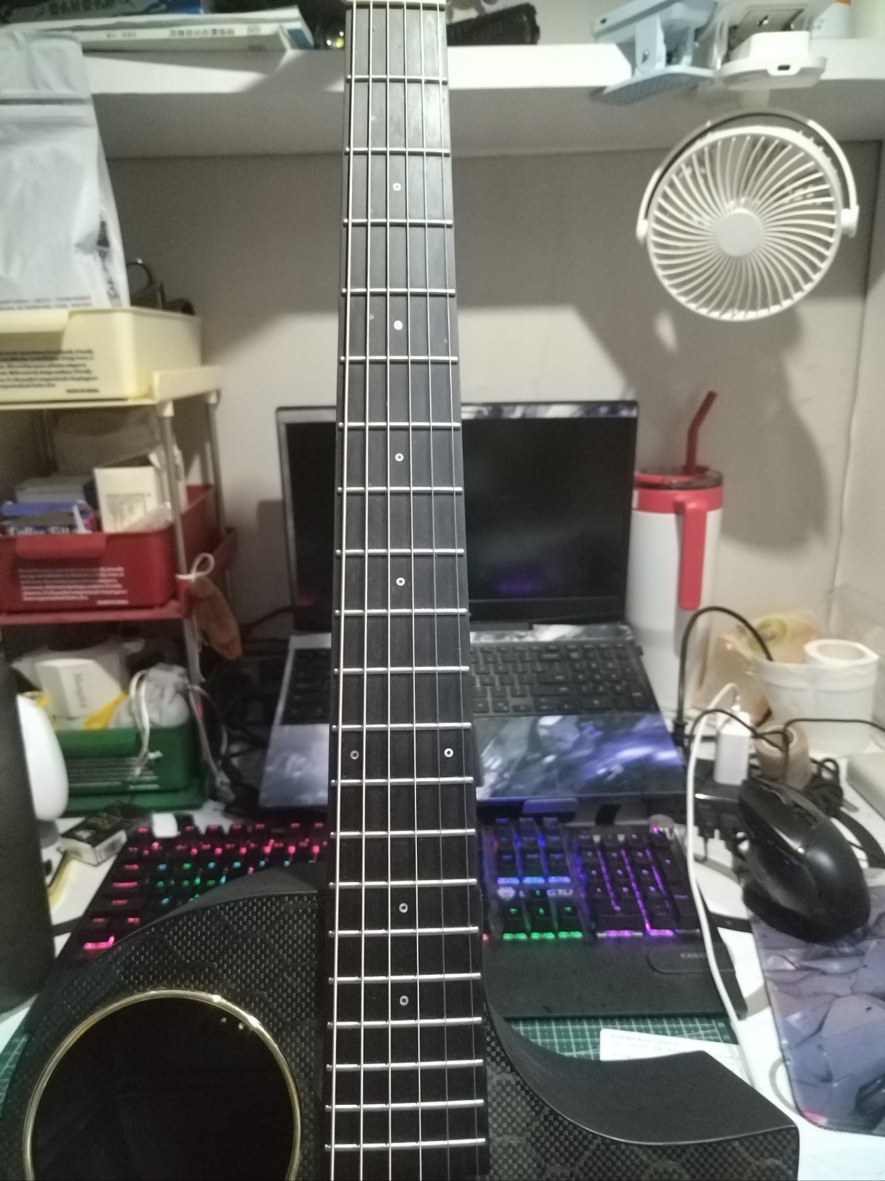 琴颈,也叫指板,是按品的地方。注意到指板上有一些小圆点,这是你弹奏的时候记忆品格的好帮手在正常情况下有圆点的品格依次是,3,5,7,9,12,15,17品请一定要牢记。