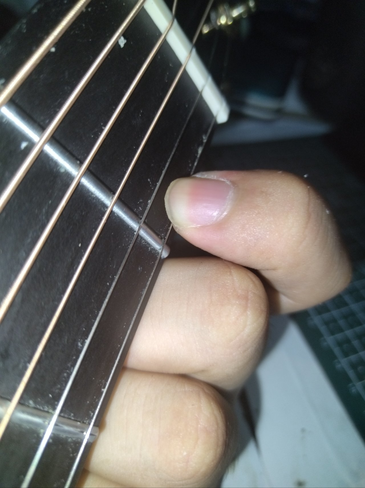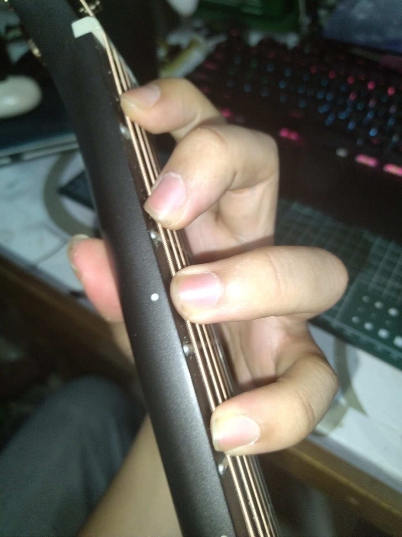 不管你用什么姿势,你的目的是让每一次拨弦都发出正常的声音。但尽量使用指尖附近的肉去按。如上图,我在这个过程中也不会保持随时垂直按压。