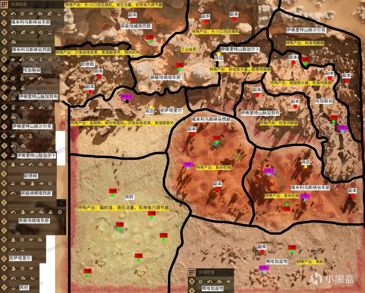 矿物:矿物主要以石头、铜矿、铁矿、碳矿、钴矿,后续还有辐射区的高级矿物,需要扑翼机飞上高地的玄武岩及铝矿等等,大后期玩家们将在大世界PVP区域探索特殊装备及采集香料。