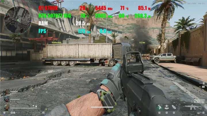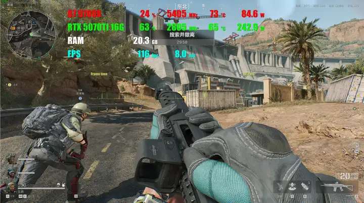 这次测试了呼声较高的三角洲行动,4K分辨率极致画质,烽夜地图里,刚下飞机120帧左右: