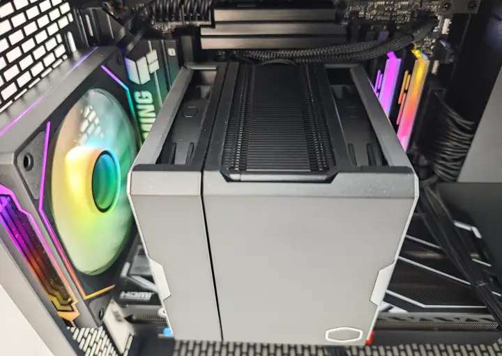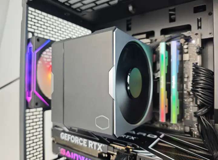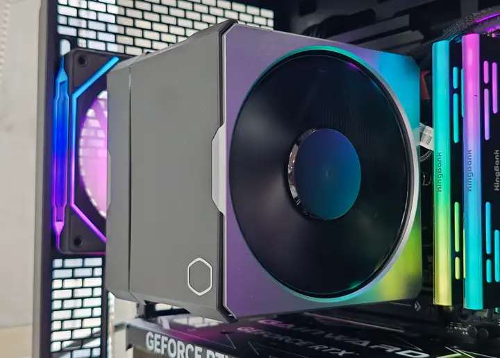 所以这次干脆上到高端风冷:6热管、密鳍片、双莫比乌斯风扇(风量大)。既不会太重影响运输安全,性能也足以压制R7 9700X!