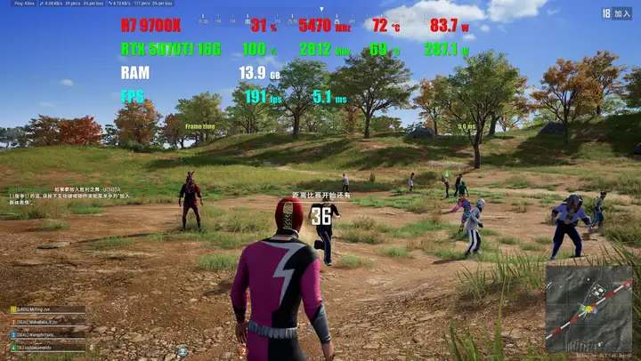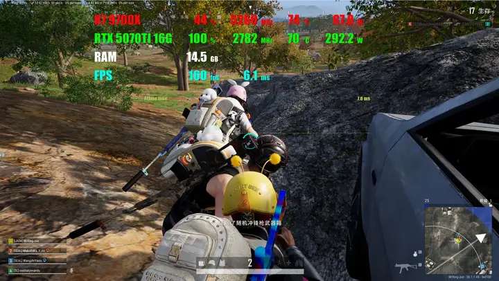 要是预算充裕,都可以配备240hz高刷显示器。再看看绝地求生,4K分辨率三高画质(110渲染比例),激战模式开局人堆里160-190帧上下: