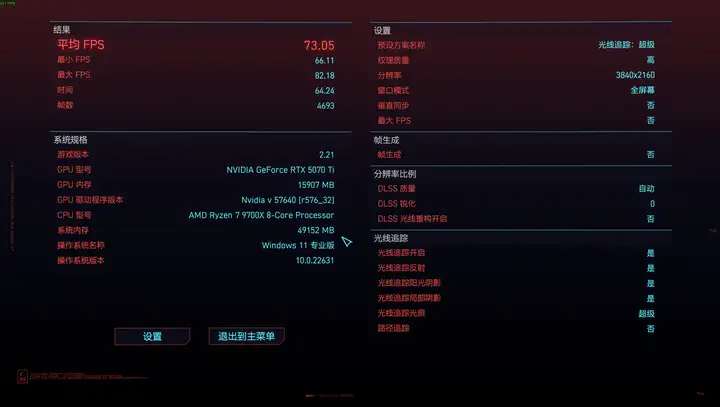 让我们开着光追再测试下赛博朋克2077,4K分辨率超级光追下。基准测试约73帧: