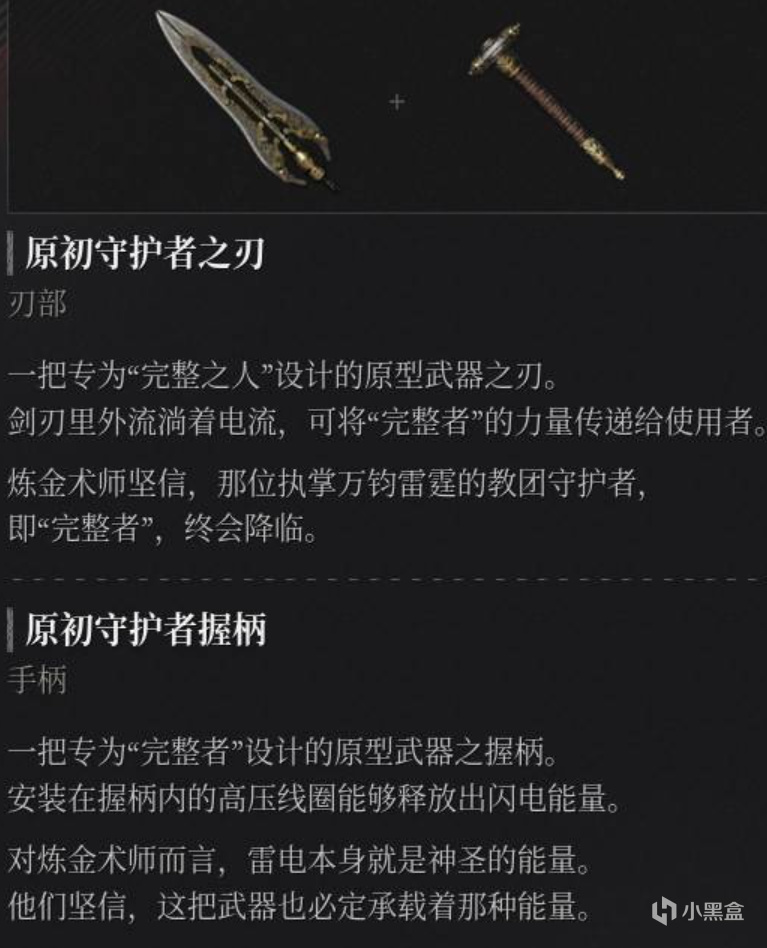 这是专为传说中的“完整之人”设计的原型武器刃部,剑刃内外流淌着电流,能够将“完整者”的力量传递给使用者。炼金术师坚信,那位执掌雷霆的教团守护者“完整者”终将降临。