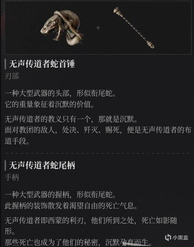 这件大型武器的头部形似衔尾蛇,其沉重感象征着沉默的价值。无声传道者的唯一教义便是沉默,对教团之敌施以处决、歼灭与赐死,即是他们的布道方式。