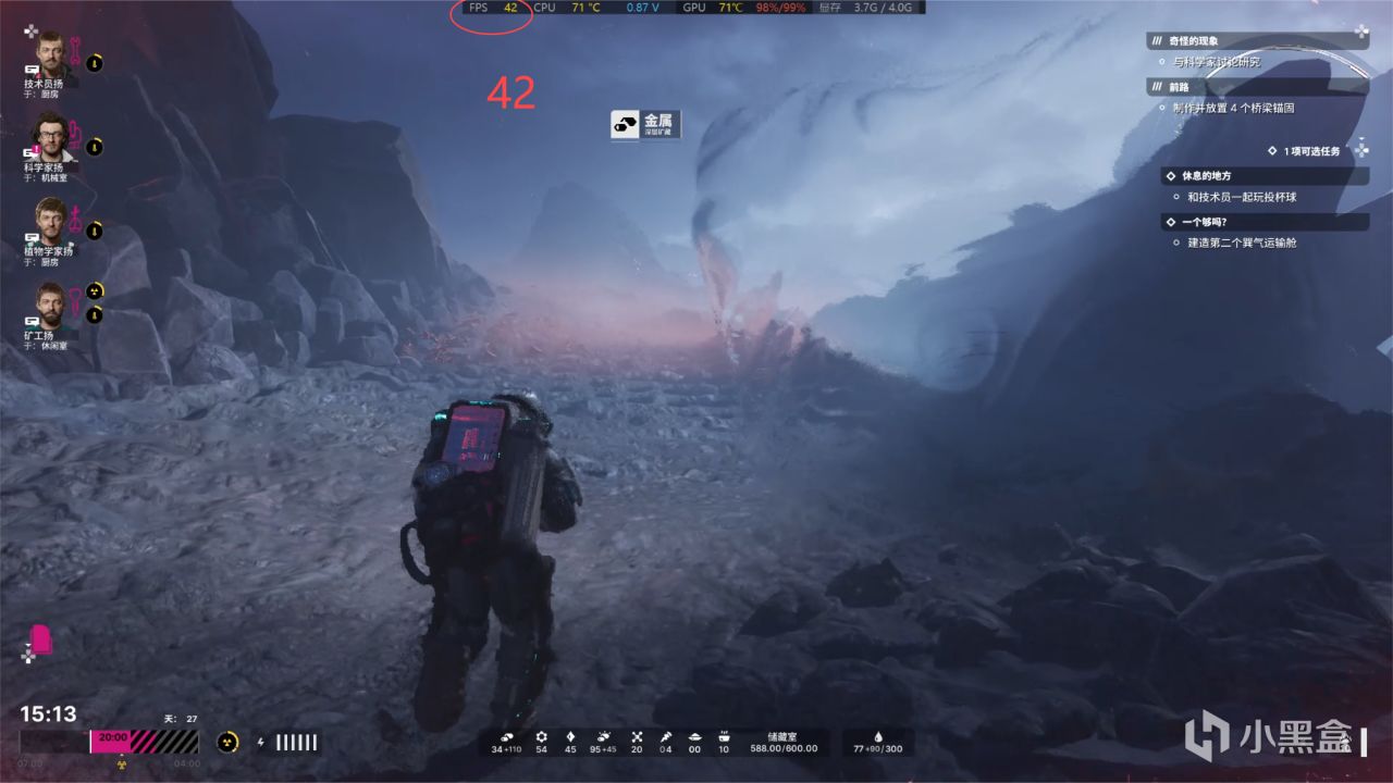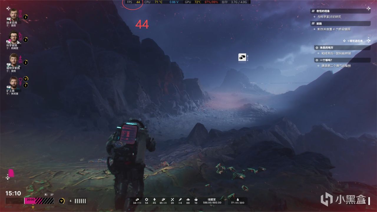 采矿作业和在据点工作是一样的,据点工作的帧数会比在野外采矿好上那么一丢丢!当然这个也会随着周围环境变化有一些波动!大致在40-47帧左右!