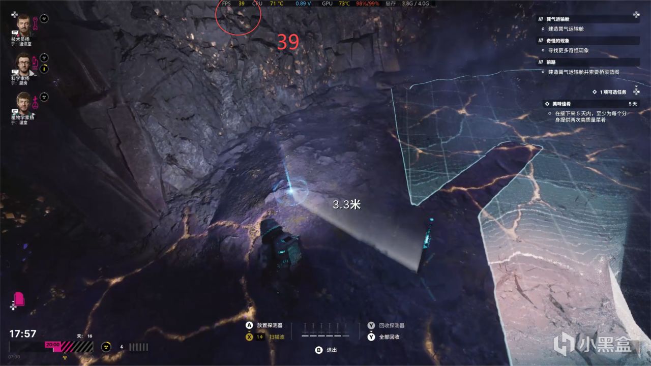 在深层矿藏周围比较有渲染,就掉帧比较严重一点点了哈!只能在30-40帧附近,平均大概是35帧左右,但是有些像比较狭小地区的深层矿藏也会可以在45-50帧附近!