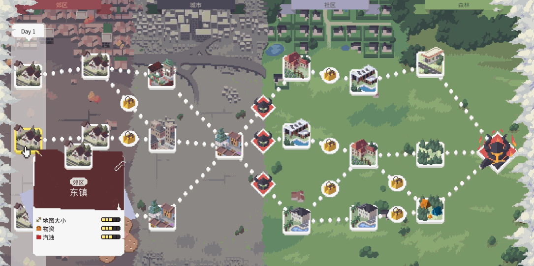 每过一天都要选择前进的地点,可以提前规划,需对目的地的地图大小、物资、汽油量进行选择,优先选择地图小,汽油和物资多的