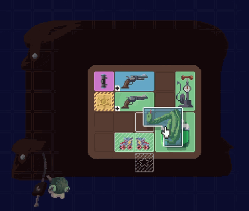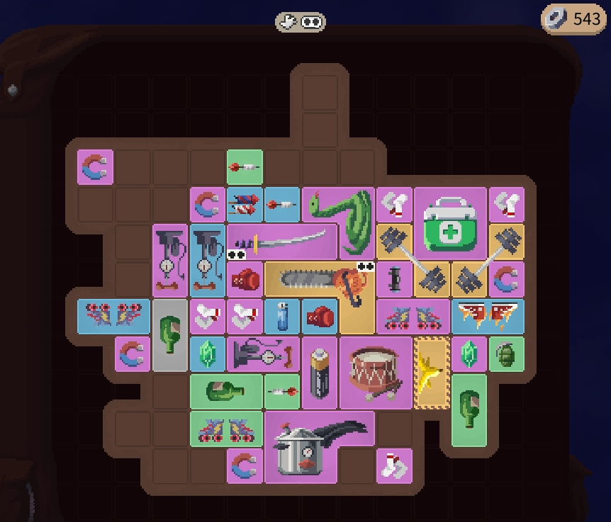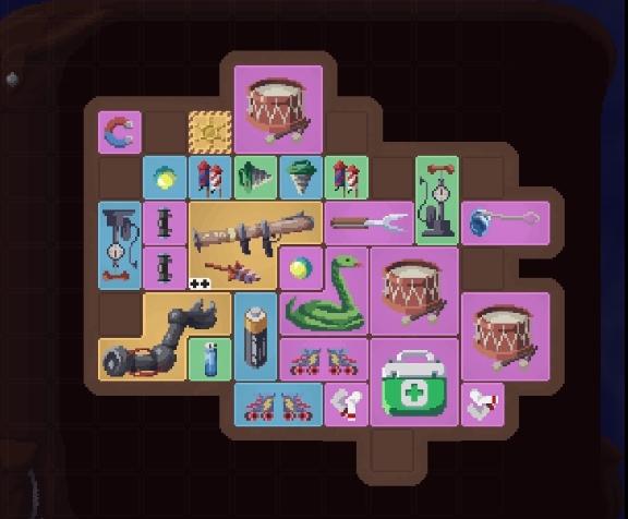 游戏最大特色是将装备管理与战斗效果深度绑定,每种武器和物品占用不同形状的背包格,需通过旋转、堆叠、排列,让物品的生效范围覆盖尽可能多的武器,形成连锁增益