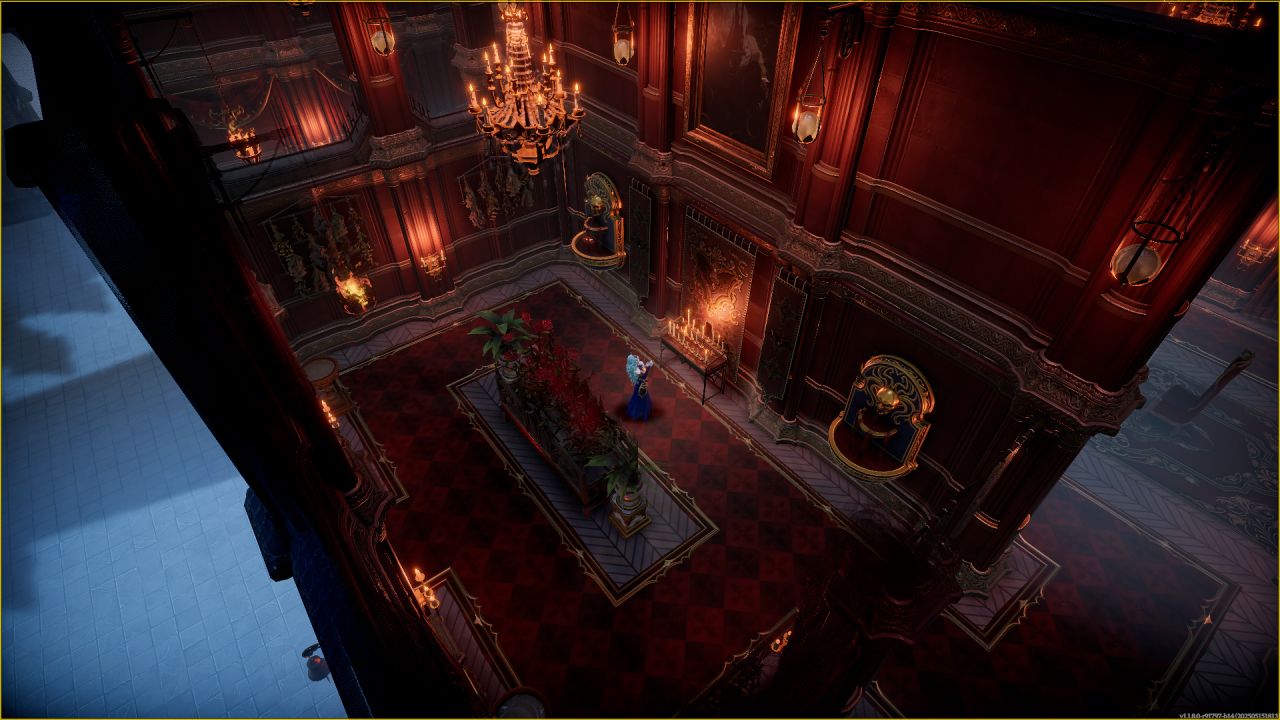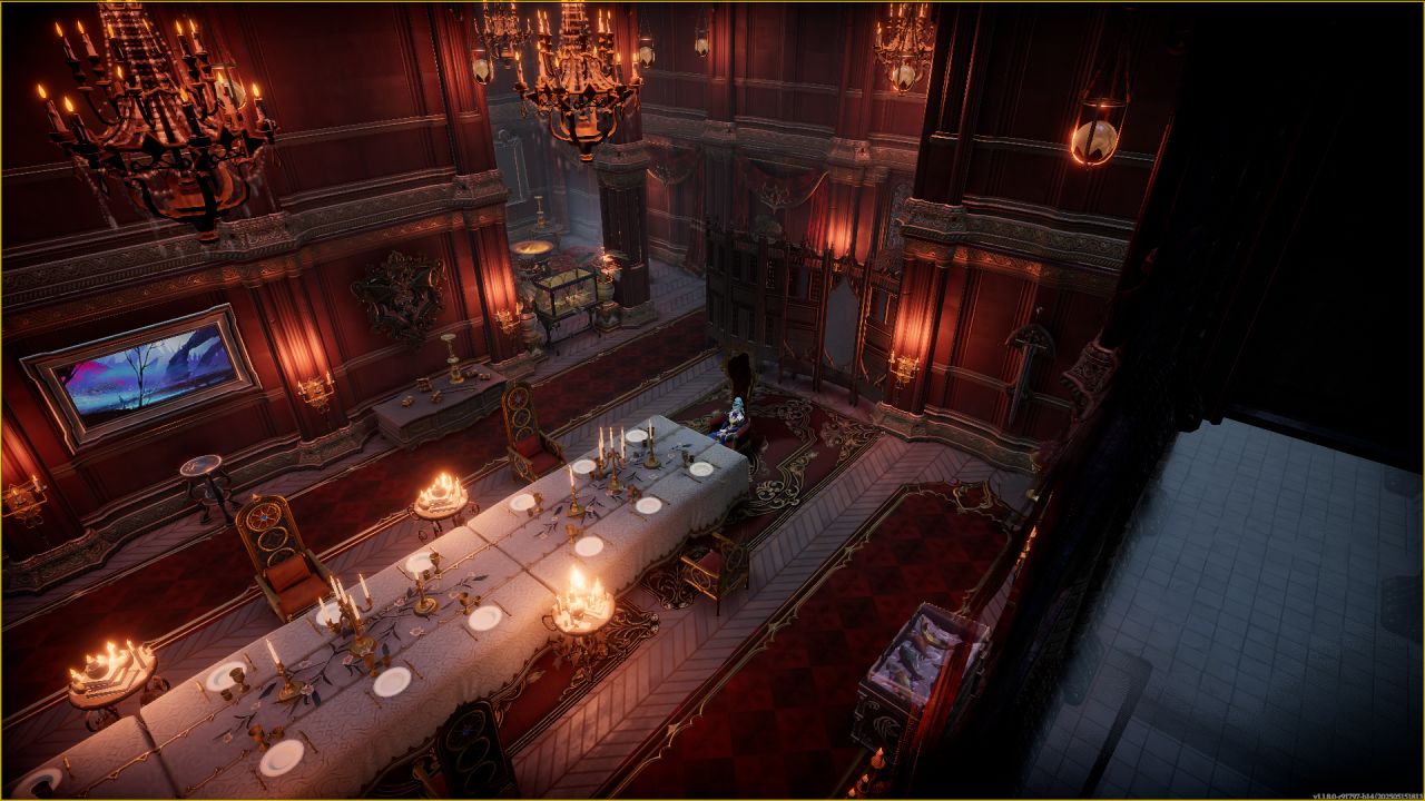 二樓是宴會大廳,因爲吊燈是放在三樓,光照照不到下面,所以桌子旁擺了發光小臺子來提亮。背後的小休息區因爲沒有截到圖展示不了了(視頻裏有)。