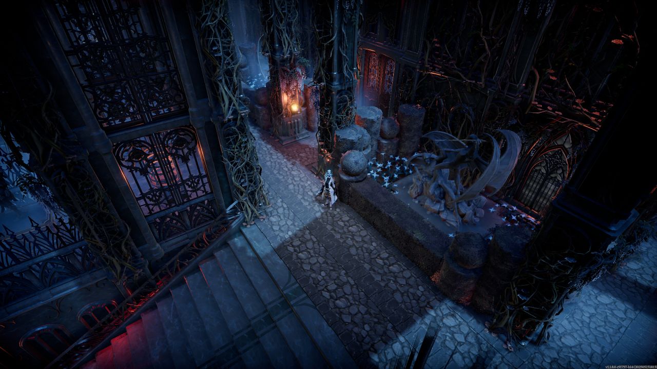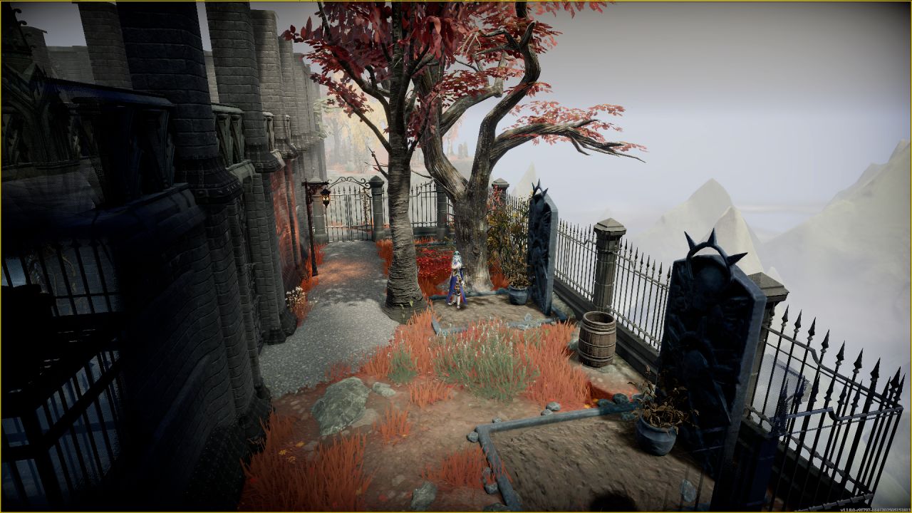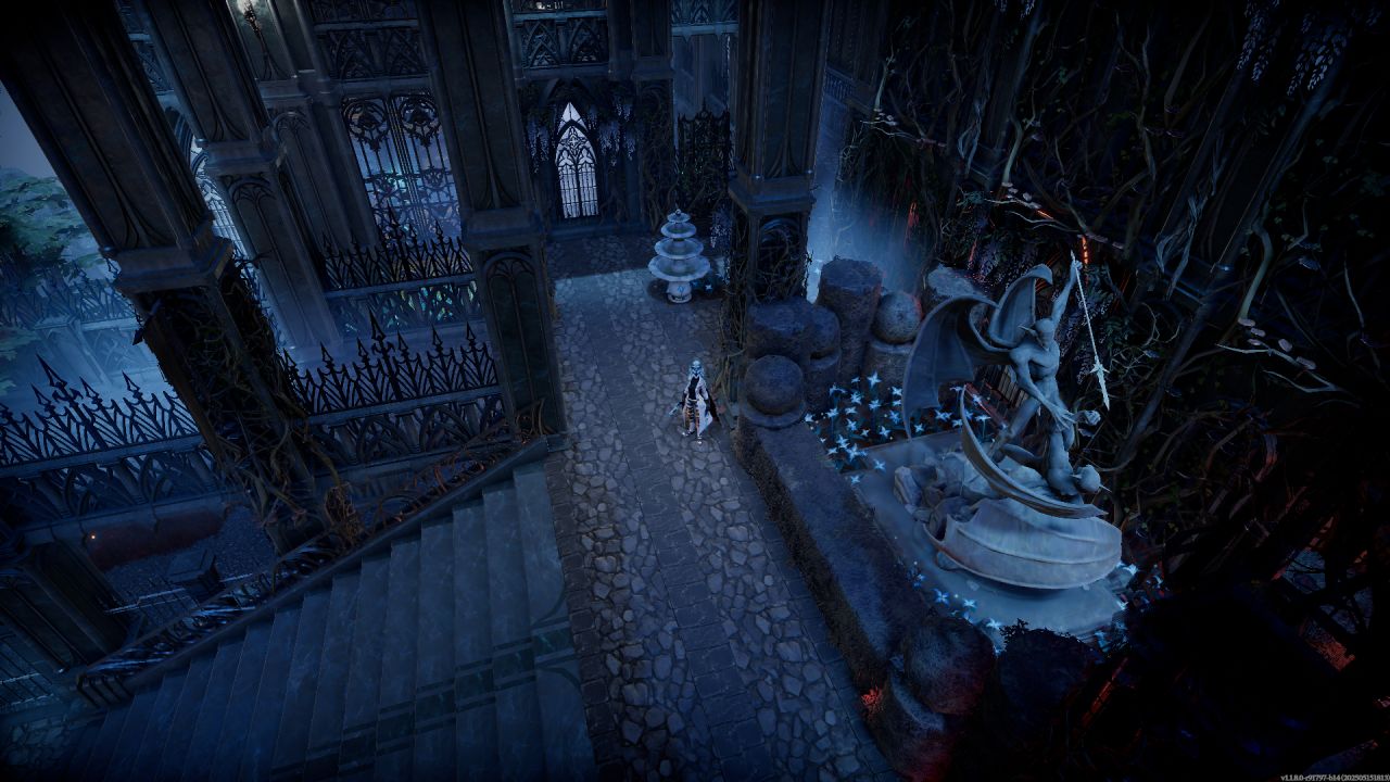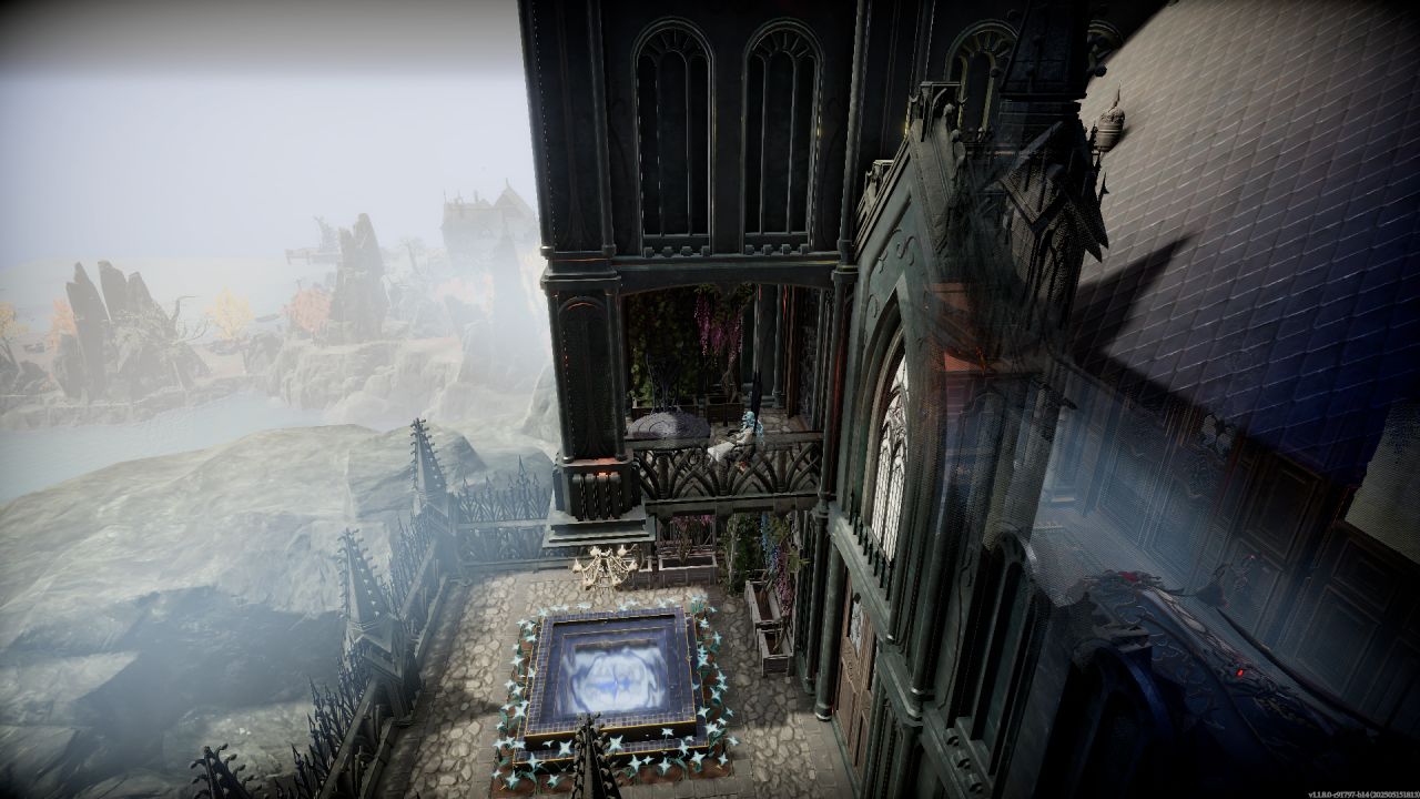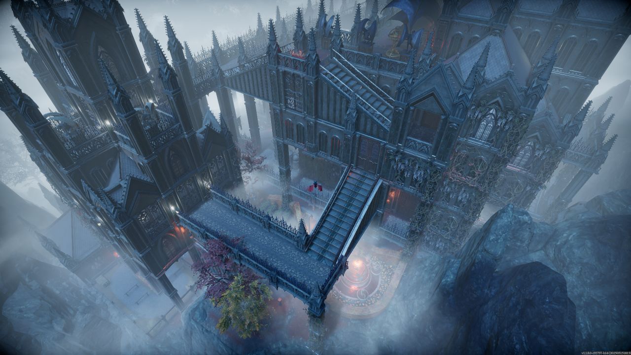 順着兩個大樓梯上來,主城堡門前用石像鬼雕塑和雪之花裝飾,塞得滿滿當當,其實單純把兩個柱子間種滿花再用綠籬一圍做個隔斷也行,但買了dlc就是要用。