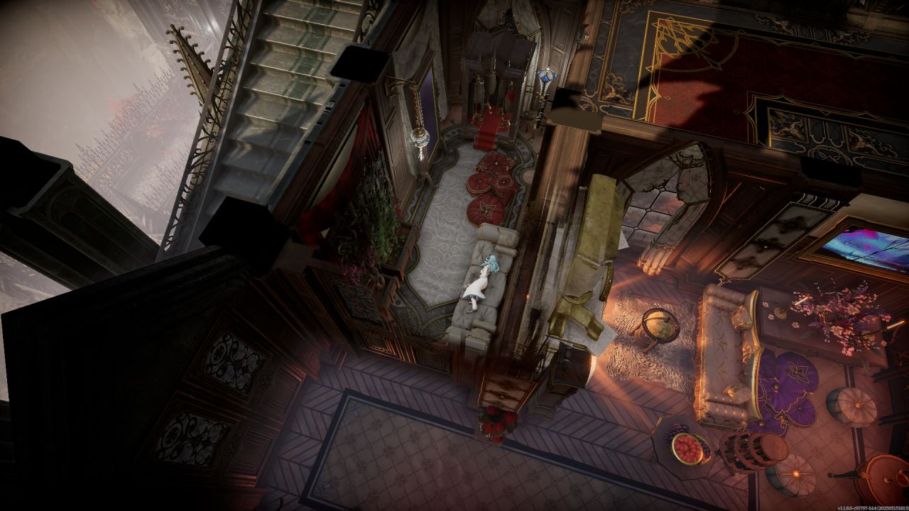 從小書房右側通道出去可抵達大大露臺,放了個小棋桌,用花園花架分隔開外部裝飾雕塑,不過截圖可能不是看的很清楚。