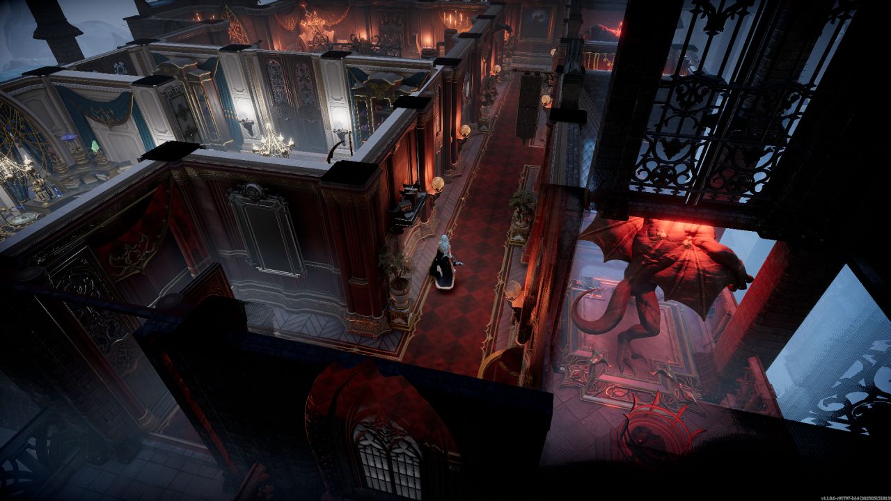 四層走廊區域,可以透過牆壁看到裝飾外部的雕像。