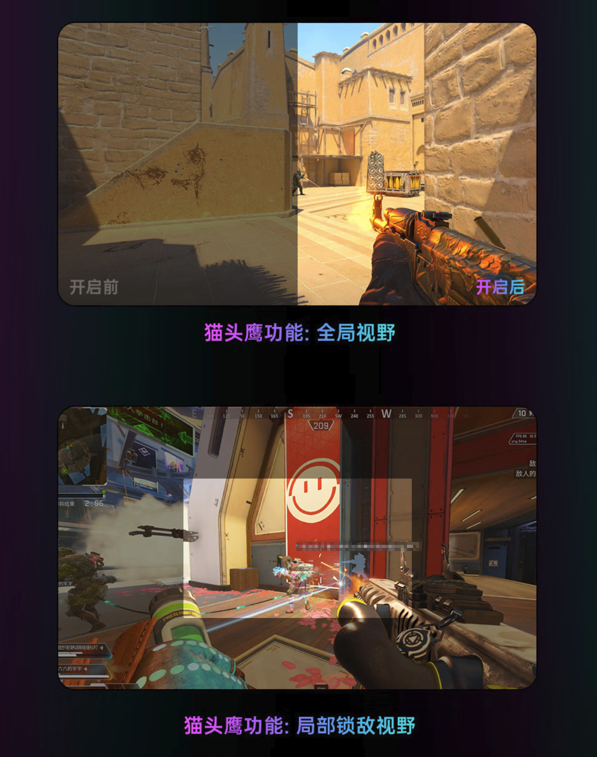 而SANC标配的猫头鹰视觉功能可以在画面中心或全局,也增强暗部画面中的高光和暗部细节,看的更清楚、打枪更精准。更重要的是,这个功能还原暗部细节的同时,不会造成画面过曝,在可以发现暗处敌人的同时,让视觉体验更好,更具有实用性。