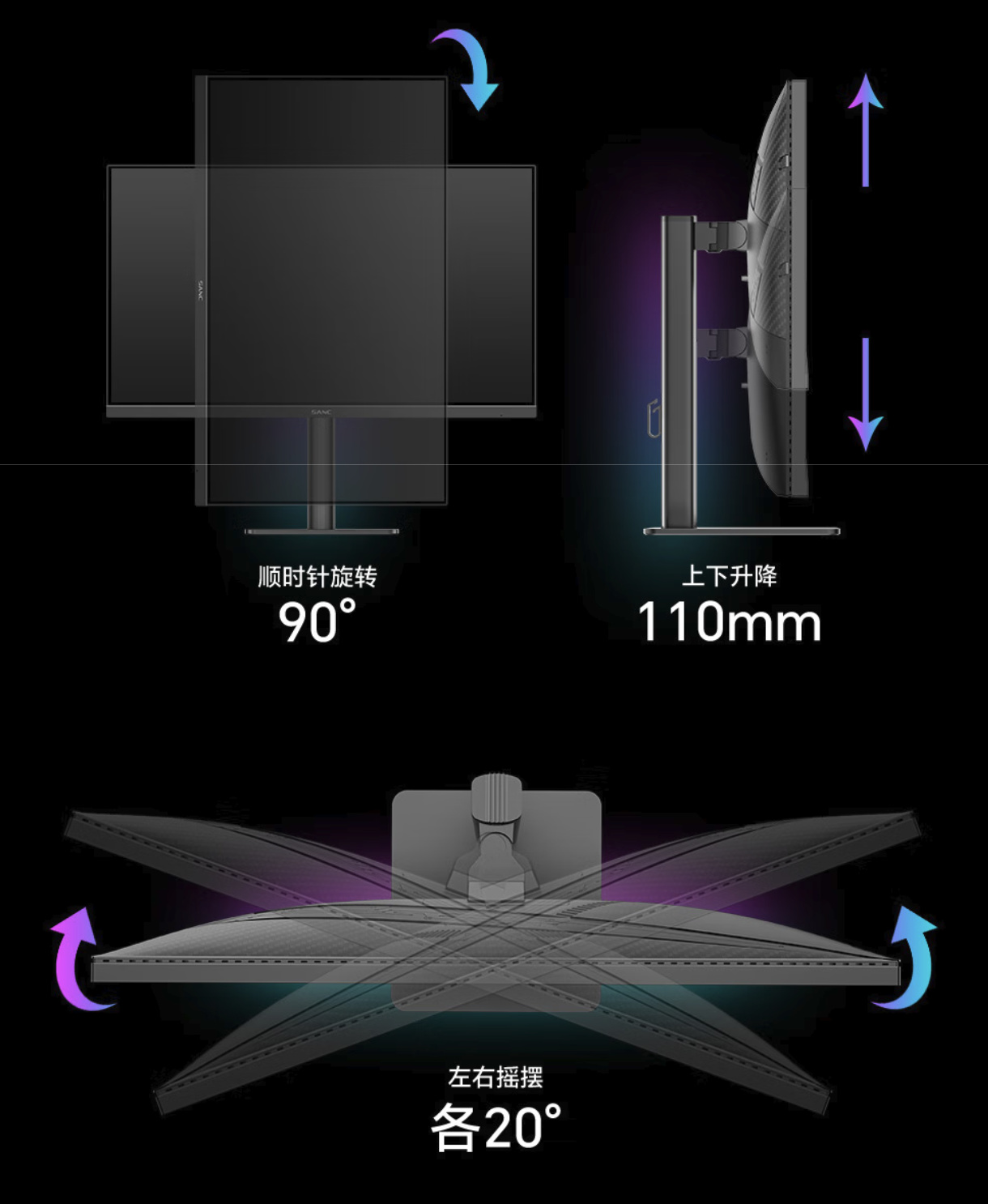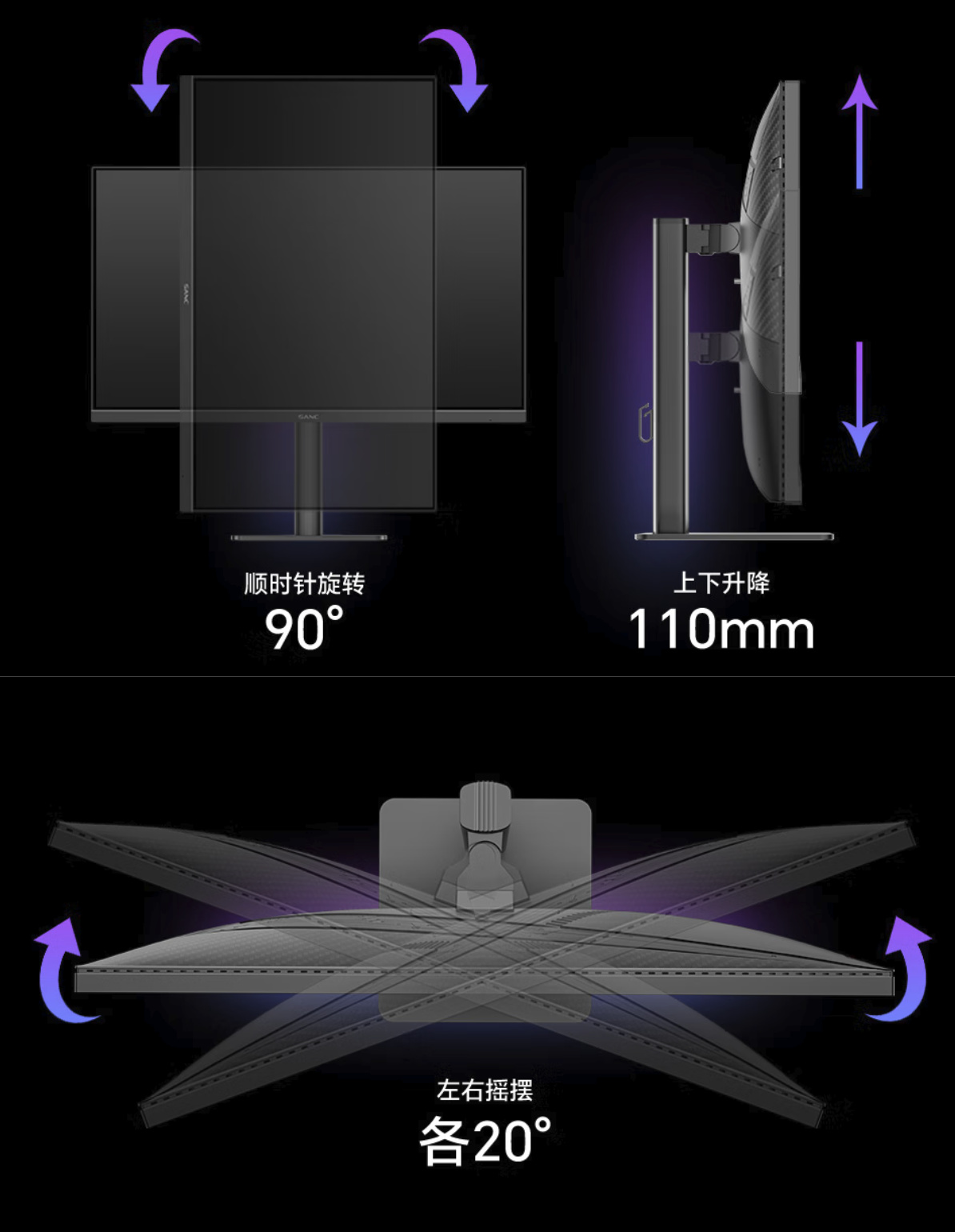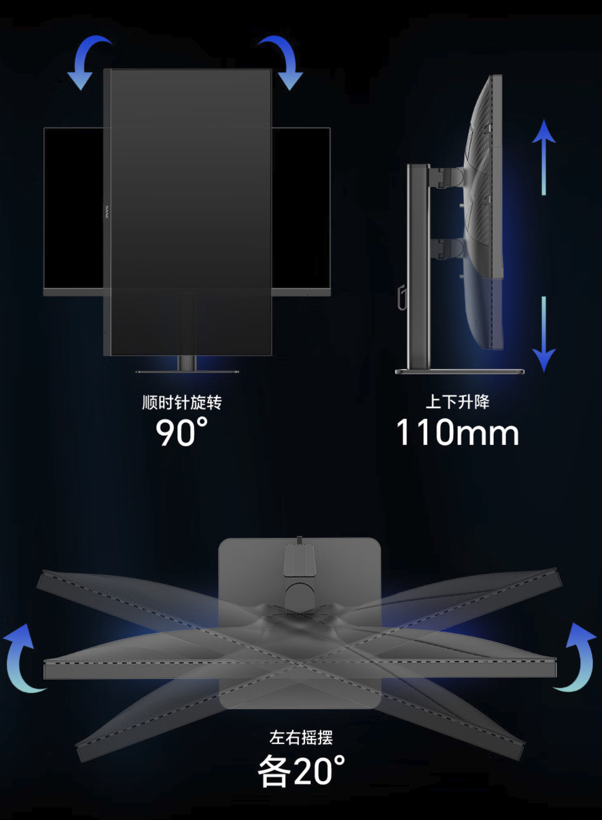 它的多功能升降支架依旧优秀,上下110mm高低调节、横屏竖屏切换、左右各20度摇摆也能让我们找到最佳视野,同时对我们的颈椎和腰部更友好一些。