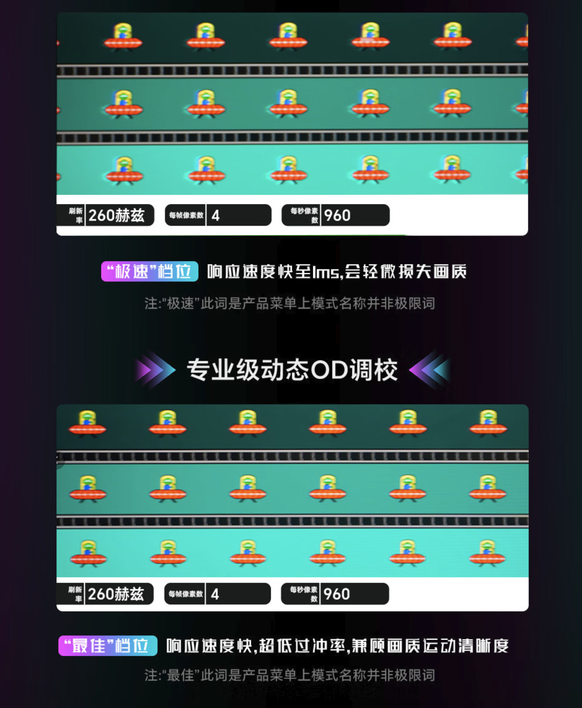 在核心参数方面,诸如260Hz超频高刷、1ms GTG疾速响应能带来细腻流畅、没有任何可见模糊的显示效果,整体体验犹如德芙般丝滑。而且动态OD专业电竞调校也能据游戏帧数的不同,自动优化最佳响应速度和最佳过冲率,大幅减少别家常见的残影和失真现象,视觉体验更优秀。
