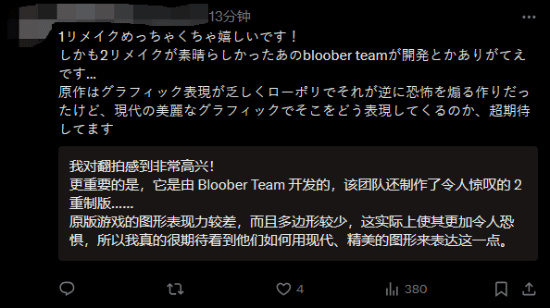 有玩家表示期待,好奇開發了《寂靜嶺2重製版》的Bloober Team將如何發揮發揮他們的能力重製初代。