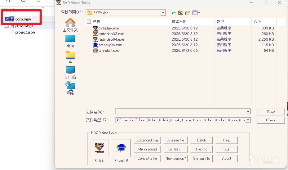 界面打開如圖,接着我們需要在RAD Video Tools中找到視頻文件所在目錄,並選中它,選中它,選中它!當然直接拖進去也行,這樣相當於複製到界面所在目錄。