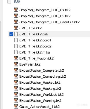 在目錄裏,會發現裏面住着一堆bk2。我們要做的是,找到【EvE_Title.bk2】,然後通過加後綴的方式備份它,防止原文件被覆蓋。如下圖.bak後綴的文件,其他後綴則是doro和miku的。