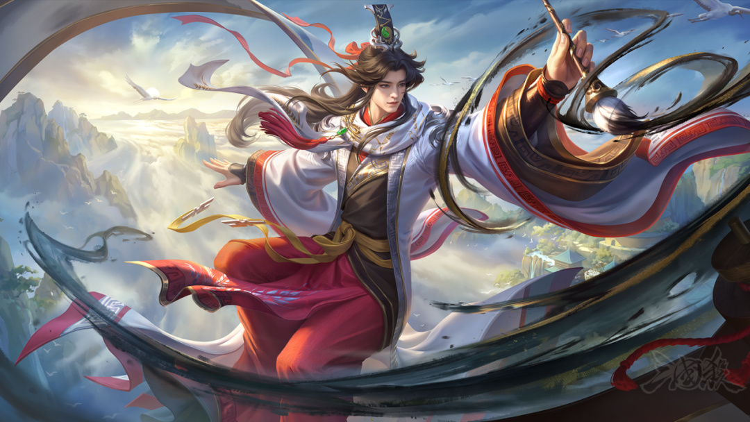衣袂飘飘似要挥毫泼墨,长袍广袖尽显飘逸。云雾缭绕的山峦、翱翔的飞鸟,都营造出超凡脱俗、大气磅礴的意境!