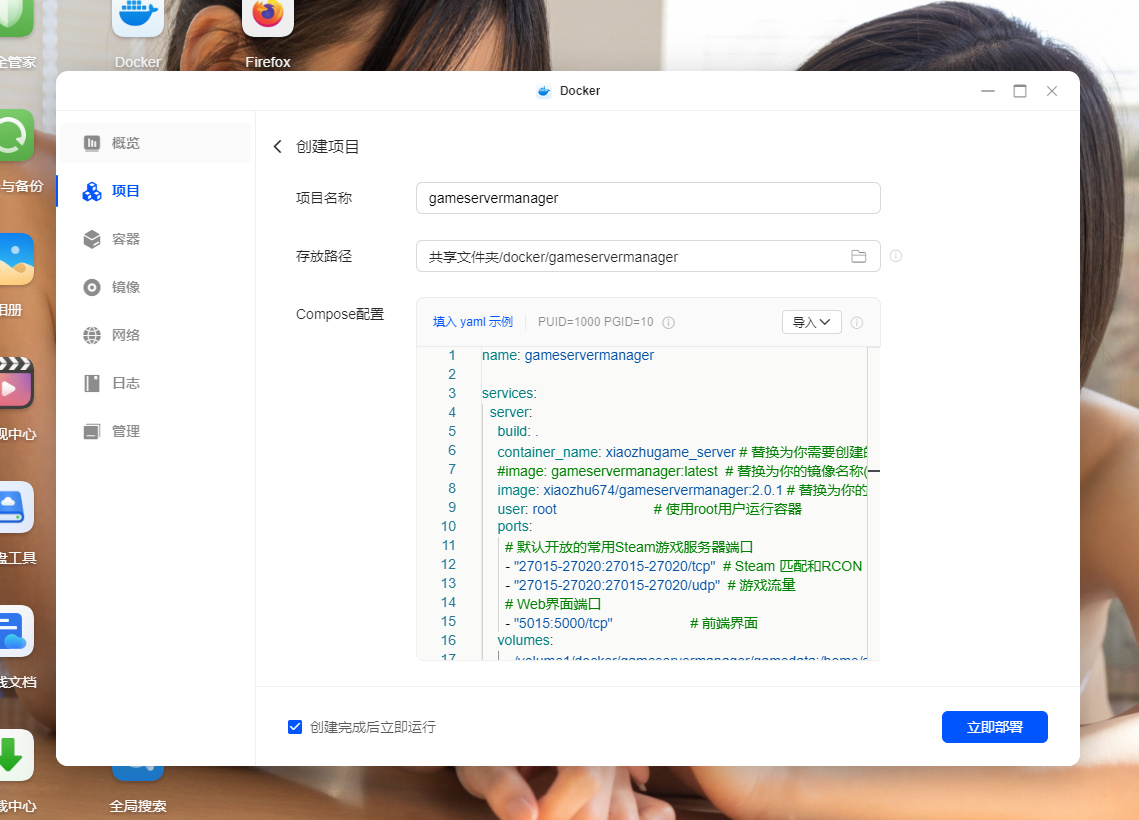 来到项目一栏点击创建,将以下内容复制进去,其中我们需要根据NAS的环境与注释来修改一些内容。