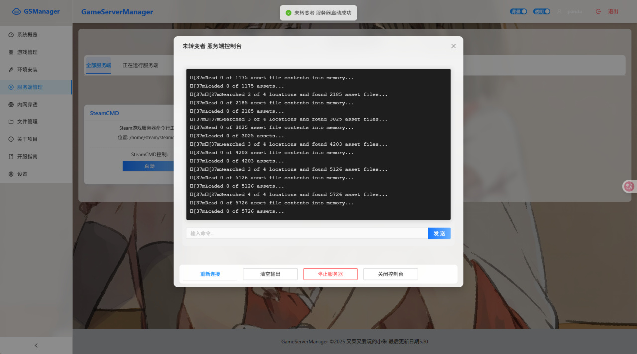 游戏安装完成之后,先启动SteamCMD控制,随后点击游戏的开服,系统会自动执行脚本,一键傻瓜式的操作,非常方便。