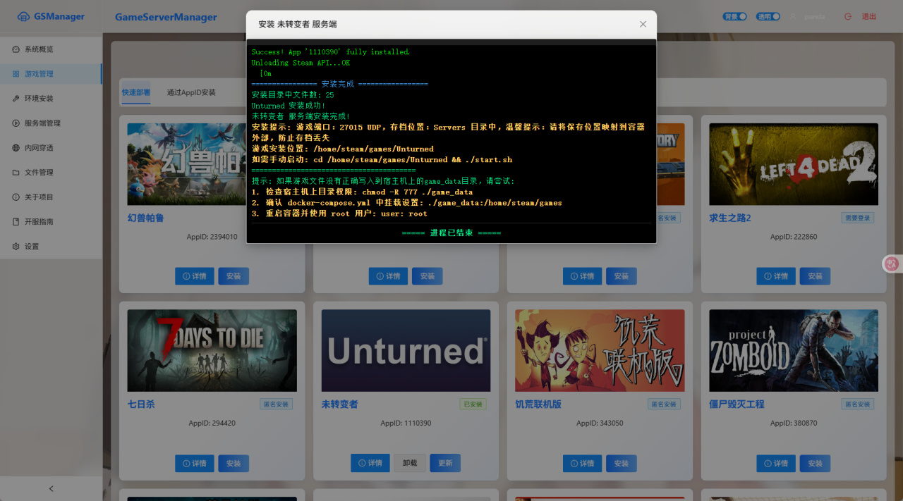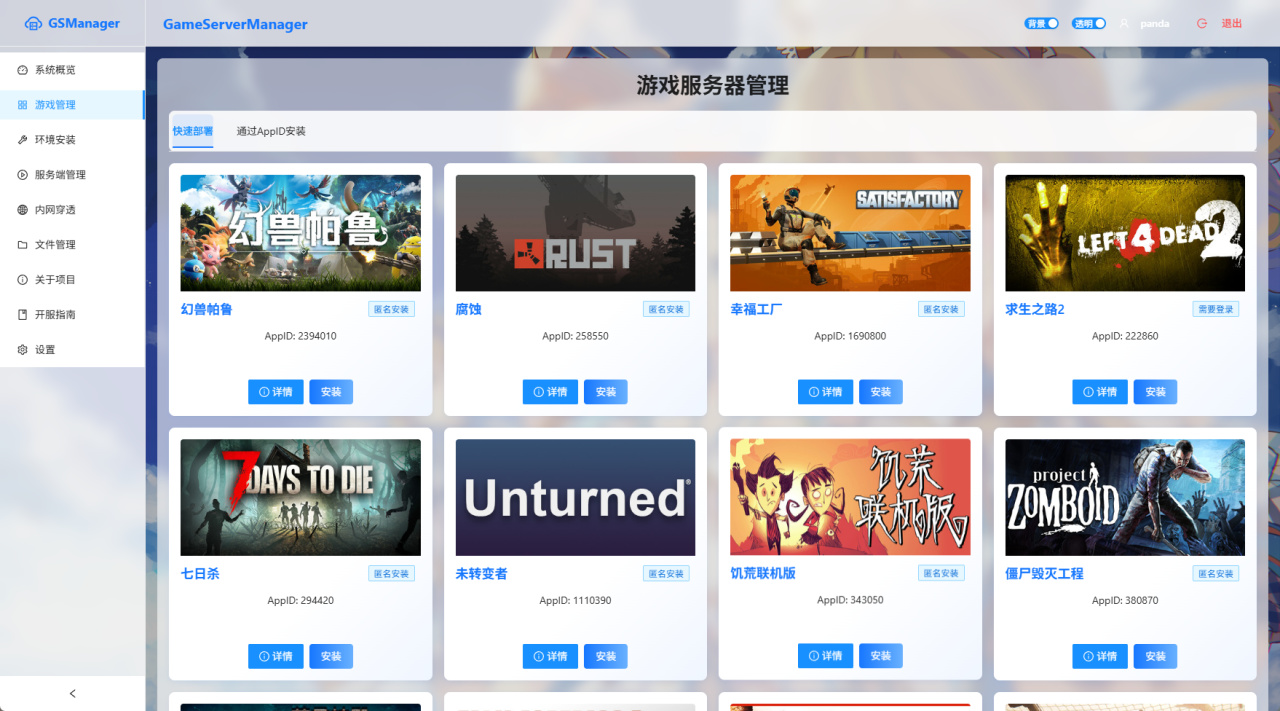 游戏管理里面能提供游戏的安装,目前一共支持32款游戏,基本上覆盖了市面上开服比较热门的游戏了,即便是没有,也可以通过输入游戏的Steam ID进行安装下载。