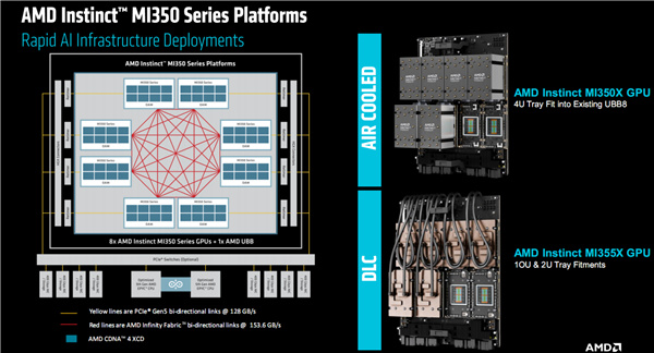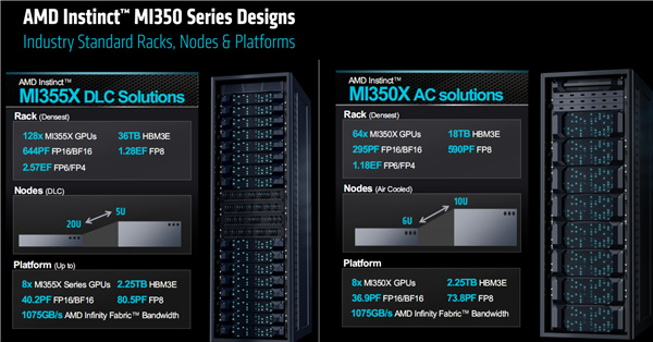 MI350系列支持風冷、機架部署,其中風冷下最多64塊並行,液冷時支持2U到5U,最多128塊並行,也可以96塊。