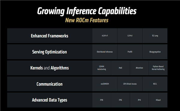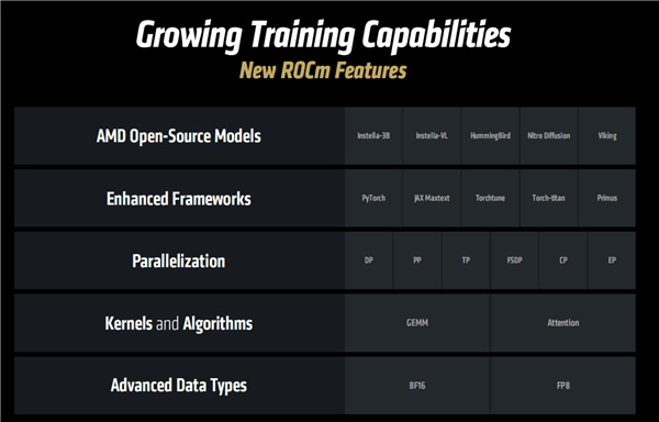 訓練方面,ROCm 7支持一系列新特性,包括多個AMD開源模型、增強的AI框架、增強的內核與算法、新的數據類型(BF16/FP8)等等。