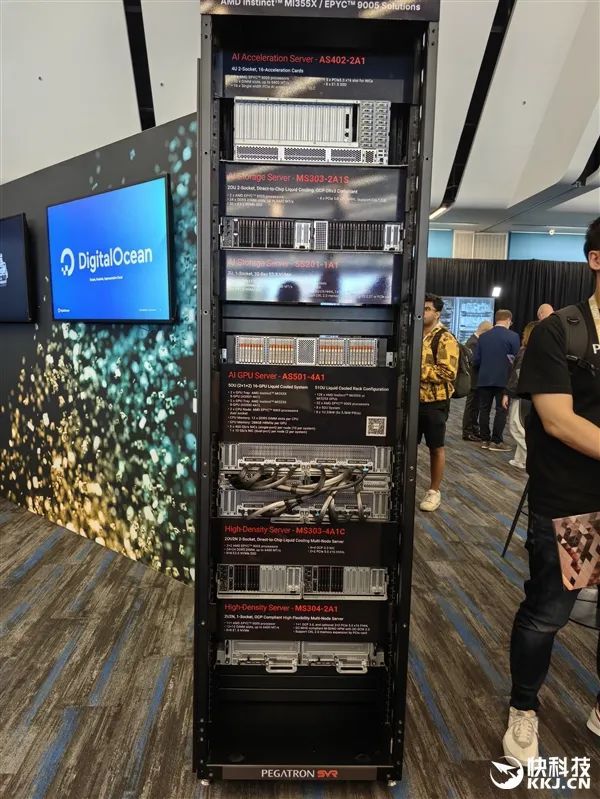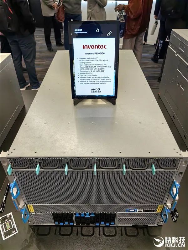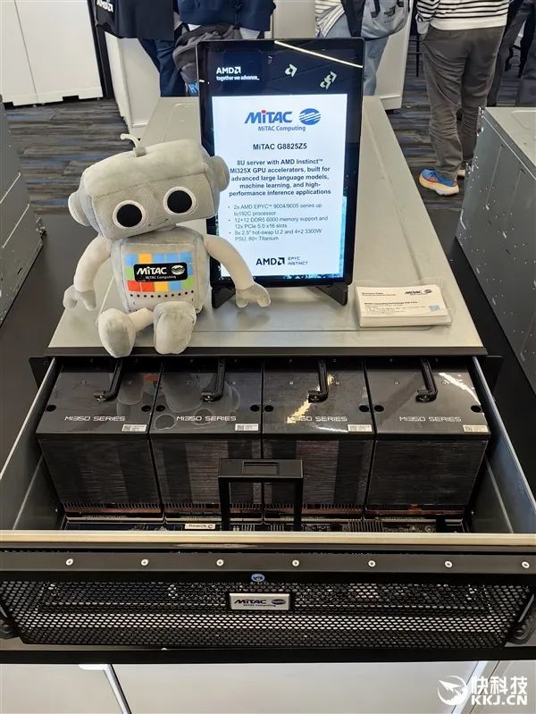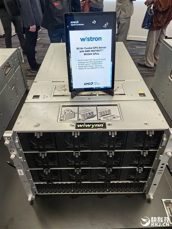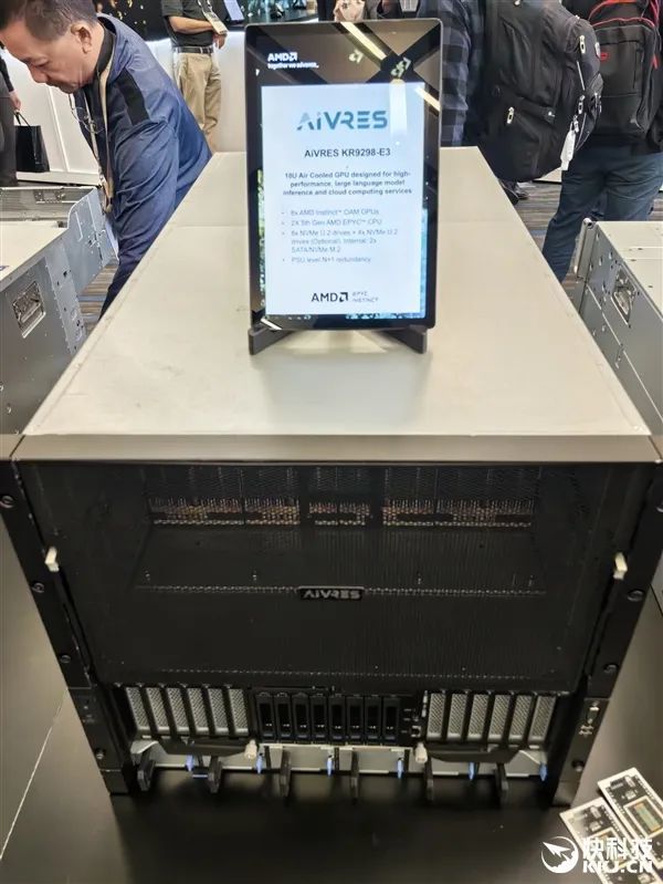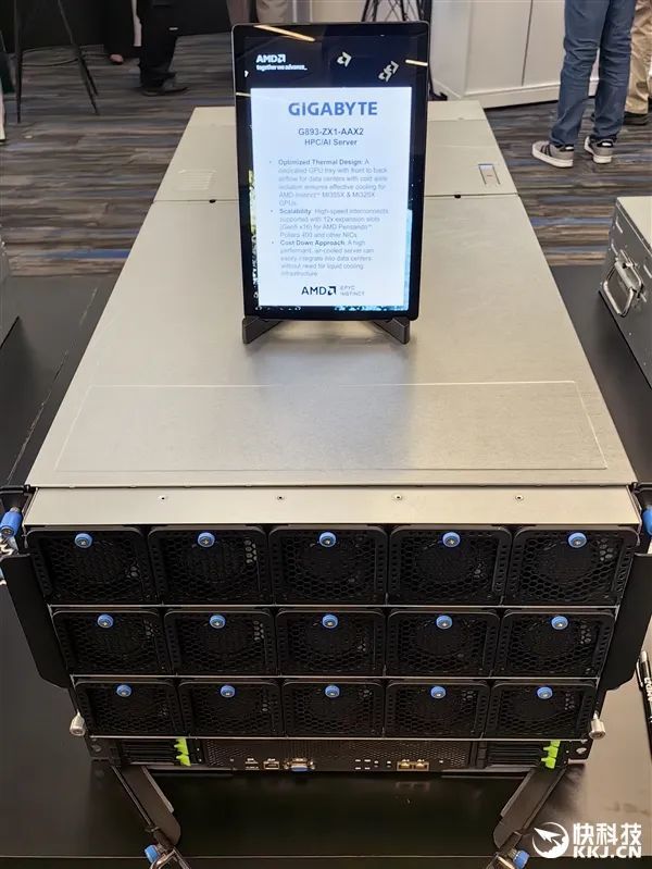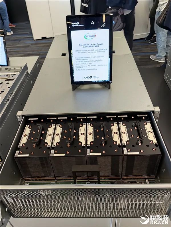 在發佈會現場,AMD與合作伙伴也展示了大量的AI服務器方案,有的已經升級到最新款MI350X、MI355X,有的雖然用的還是老一代MI300X、MI325X,但升級也很輕鬆,只是時間問題。