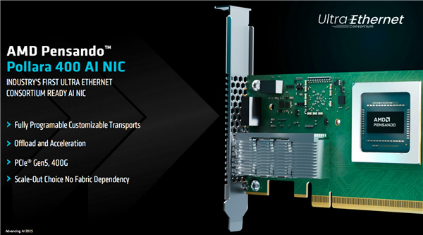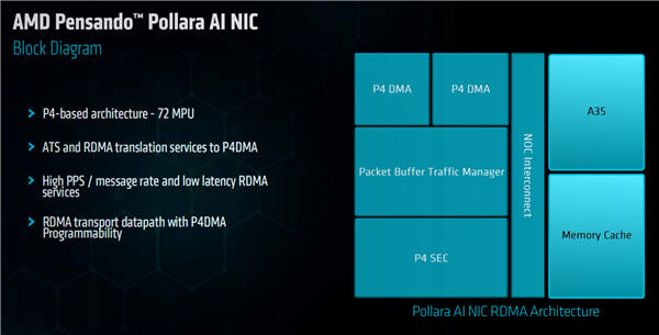 特別值得一提的是,作爲AI加速系統平臺的一部分,AMD此前還發布了一款超高性能網卡Pensando 400 AI(代號“Pollara”),首次與EPYC CPU、Instinct GPU一起組成完整的平臺方案。