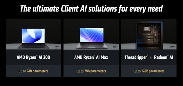 AMD還順帶介紹了下全線的消費級AI解決方案,比如移動端的銳龍AI 300系列最高可以本地端側運行240億參數大模型,銳龍AI Max 300系列更是能跑到700億參數,而新一代線程撕裂者處理器、Radeon AI顯卡組合最高可以搞定1280億參數。