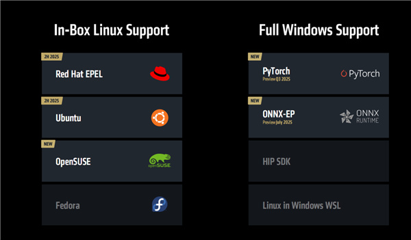 除了數據中心、企業端,ROCm 7在消費端也有全面改進,新增原生支持Red Hat EPEL、Ubuntu、OpenSUSE等更多的Linux系統發行版,其中前兩者下半年實現。
