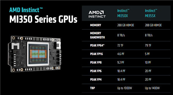 MI350X的性能削減了8%,FP4峯值可達18.4PFlops,整卡功耗最高1000W,和MI325X持平。