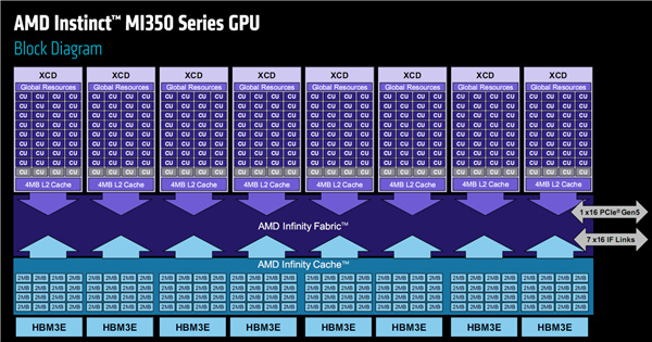 這是MI350系列的內部架構和佈局圖。
