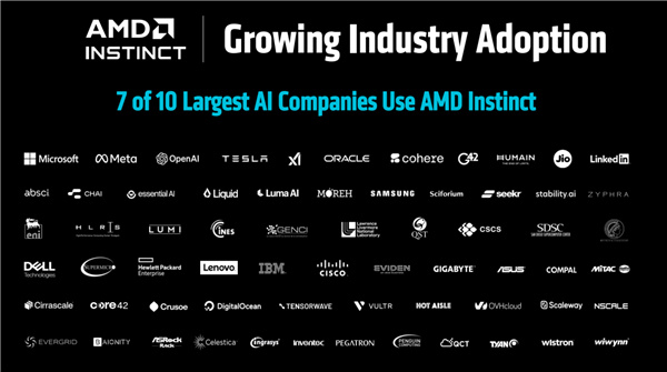 生態與應用合作伙伴方面,AMD Instinct的朋友圈正在快速擴大,全球十大AI企業中已經有七家用上了Instinct,包括微軟、Meta、OpenAI、特斯拉、xAI、甲骨文等。