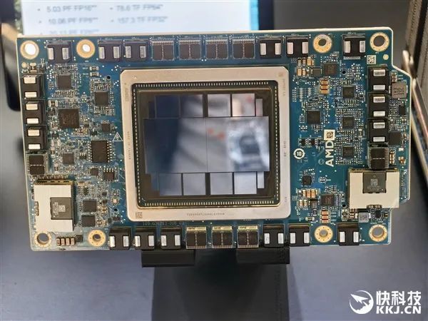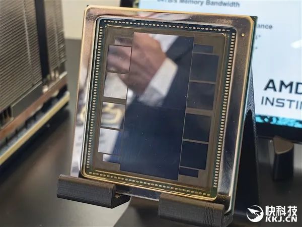 中間兩個最大的,就是兩顆XCD計算模塊,通過Infinity Fabric高速總線緊密結合在一起,周邊排布着八顆HBM3E內存,單顆36GB,總計288GB。