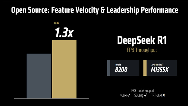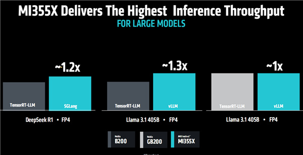 有了ROCm 7的加持,MI355X面對NVIDIA B200也是絲毫不弱,比如DeepSeek R1 FP8吞吐量可以領先達30%。