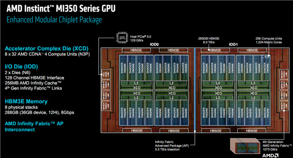 IOD模塊一共2個,集成128個通道HBM3E內存控制器、256MB Infinity Cache無限緩存,容量和上代相同,還支持第四代Infinity Fabric互連總線,雙向帶寬提升至1075GB/s。