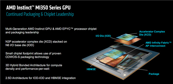 MI350系列繼續採用延續多代的chiplets芯粒設計,仍然分爲頂層的XCD(加速器計算模塊)、底部的IOD(輸入輸出模塊)和周圍的HBM3E內存模塊。