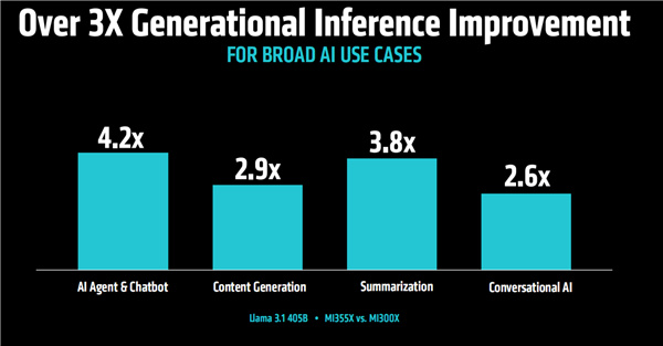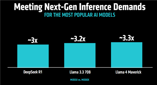 當然更關鍵的是實際性能,官方宣稱MI355X對比MI300X在不同AI大模型中的推理性能普遍提升了3倍甚至更多。