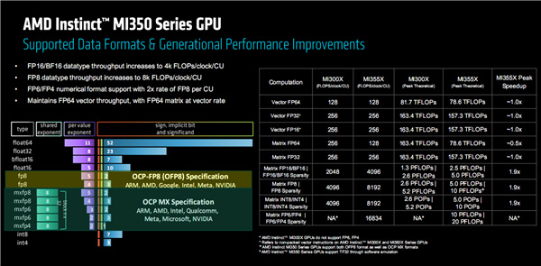 通過提升每個CU單元每時鐘週期的性能,FP16、BF16、FP8、FP6、FP4的單位性能都得到了顯著提升。