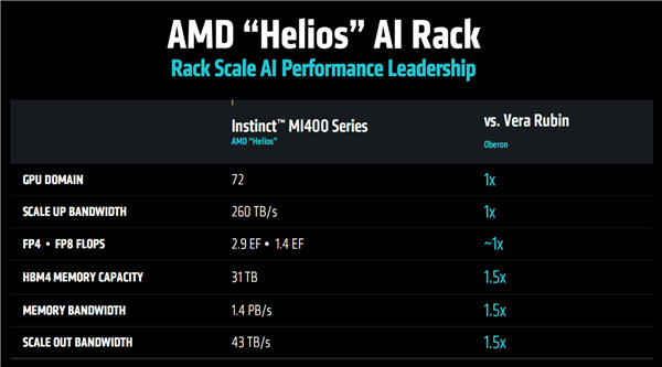 Helios AI機架可容納最多72塊MI400系列GPU,對標NVIDIA NL72,總帶寬260TB/s,HBM4內存總容量31TB、總帶寬1.4PB/s,超過競品足足一半。