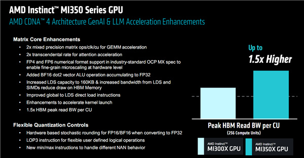MI350系列針對生成式AI、LLM的具體改進,包括矩陣核心的提升和更靈活的量化機制,過於專業就不一一解釋了。