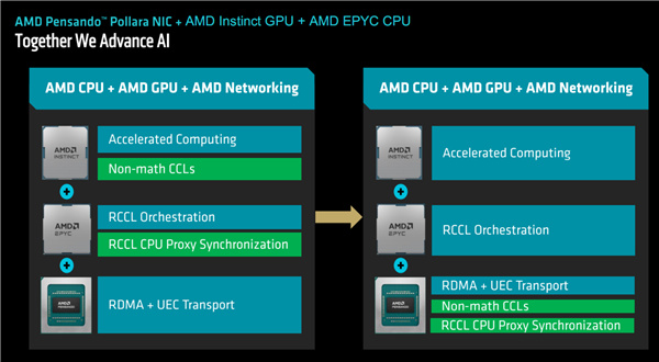 EPYC CPU處理器、Instinct GPU加速卡、Pensando網卡無縫配合,尤其是網卡可以卸載接手並高效處理CPU、GPU的部分工作,釋放平臺的最大性能潛力。