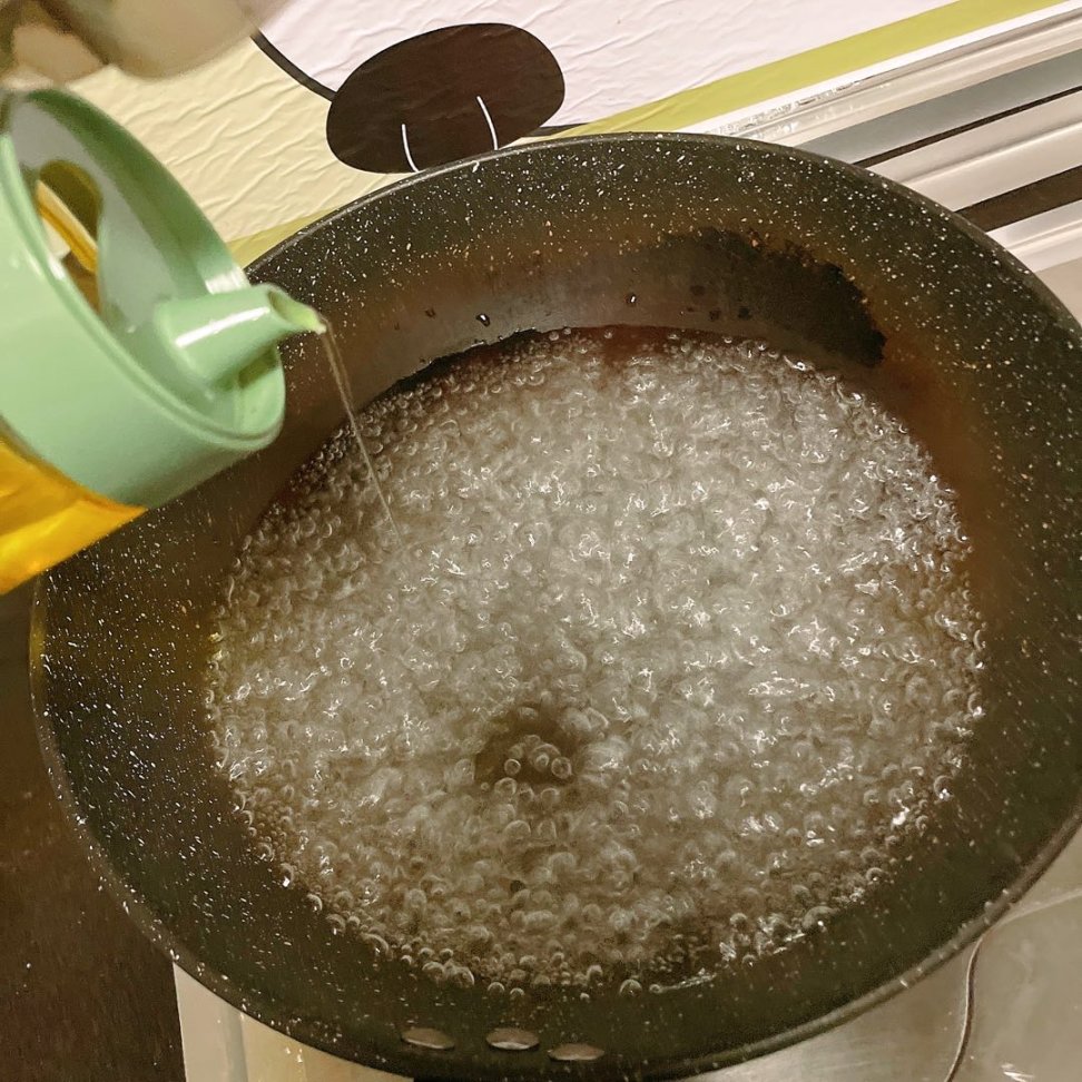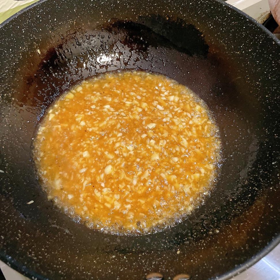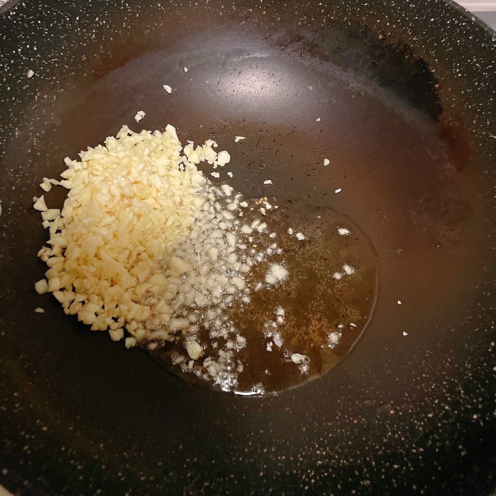 锅中下入猪油小火将蒜末炒香(不要大火,大火会导致蒜末糊掉,就不好吃了)