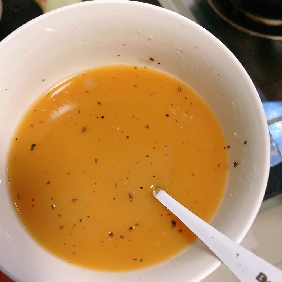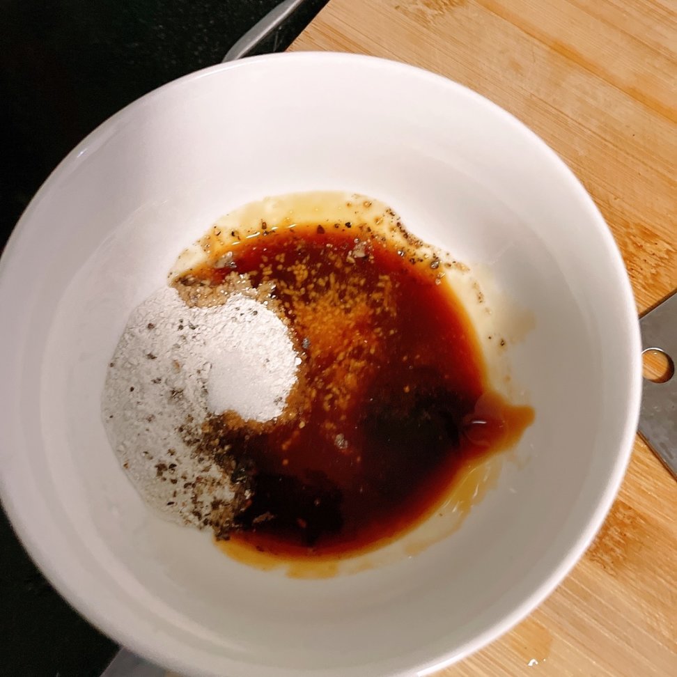 调一碗料汁,碗中加入适量淀粉、生抽、蚝油、胡椒粉